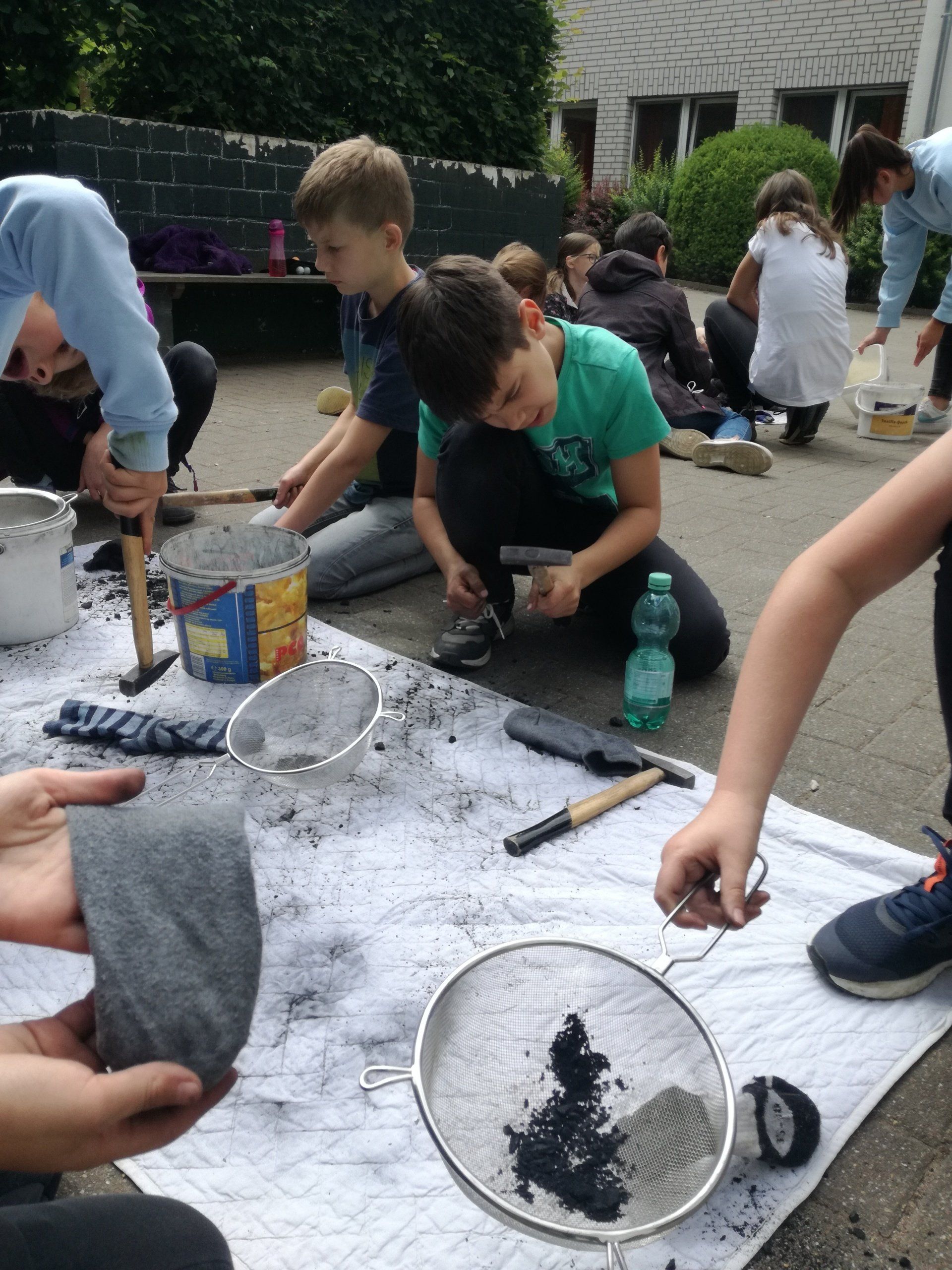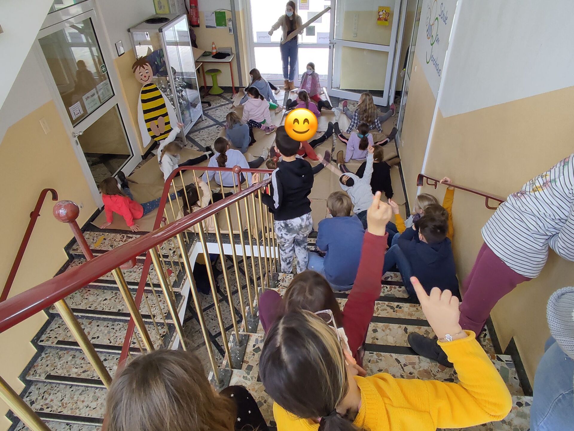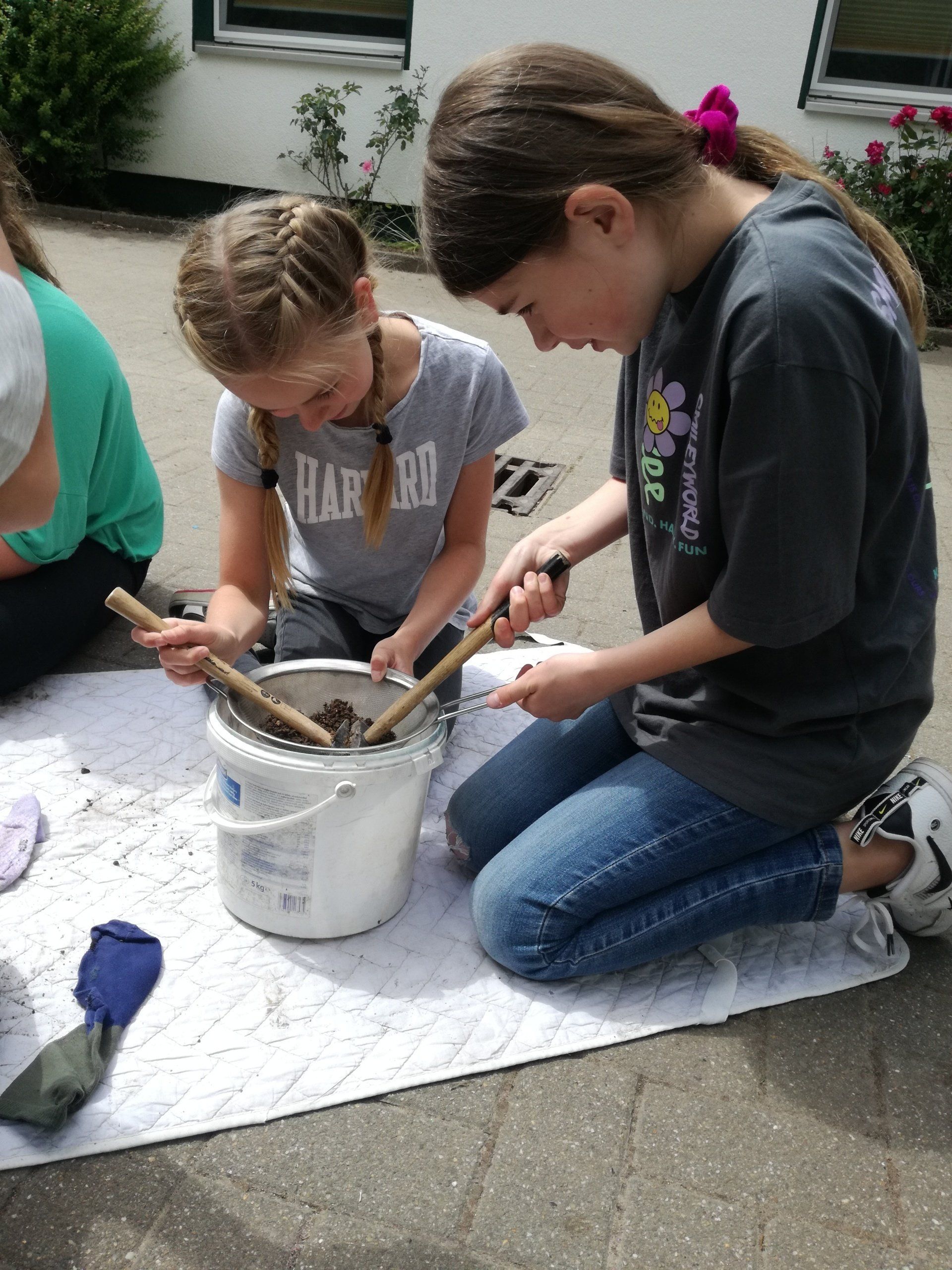 Heute haben wir die Imkerei "Gerritz" hier in Millingen besucht. Wir durften uns das richtige Imker-Werkzeug ansehen, anschließend haben wir ein Bienenvolk im Schaukasten betrachtet. Wir konnten sogar die Bienenkönigin erkennen. Ein Highlight war das "Honig schleudern". Jedes Kind durfte einmal selber Honig herstellen. Am Ende waren wir sehr mutig und haben Bienen-Drohnen, also männliche Bienen, in unseren Händen gehalten. Manche Drohnen haben uns bis zur Schule begleitet!