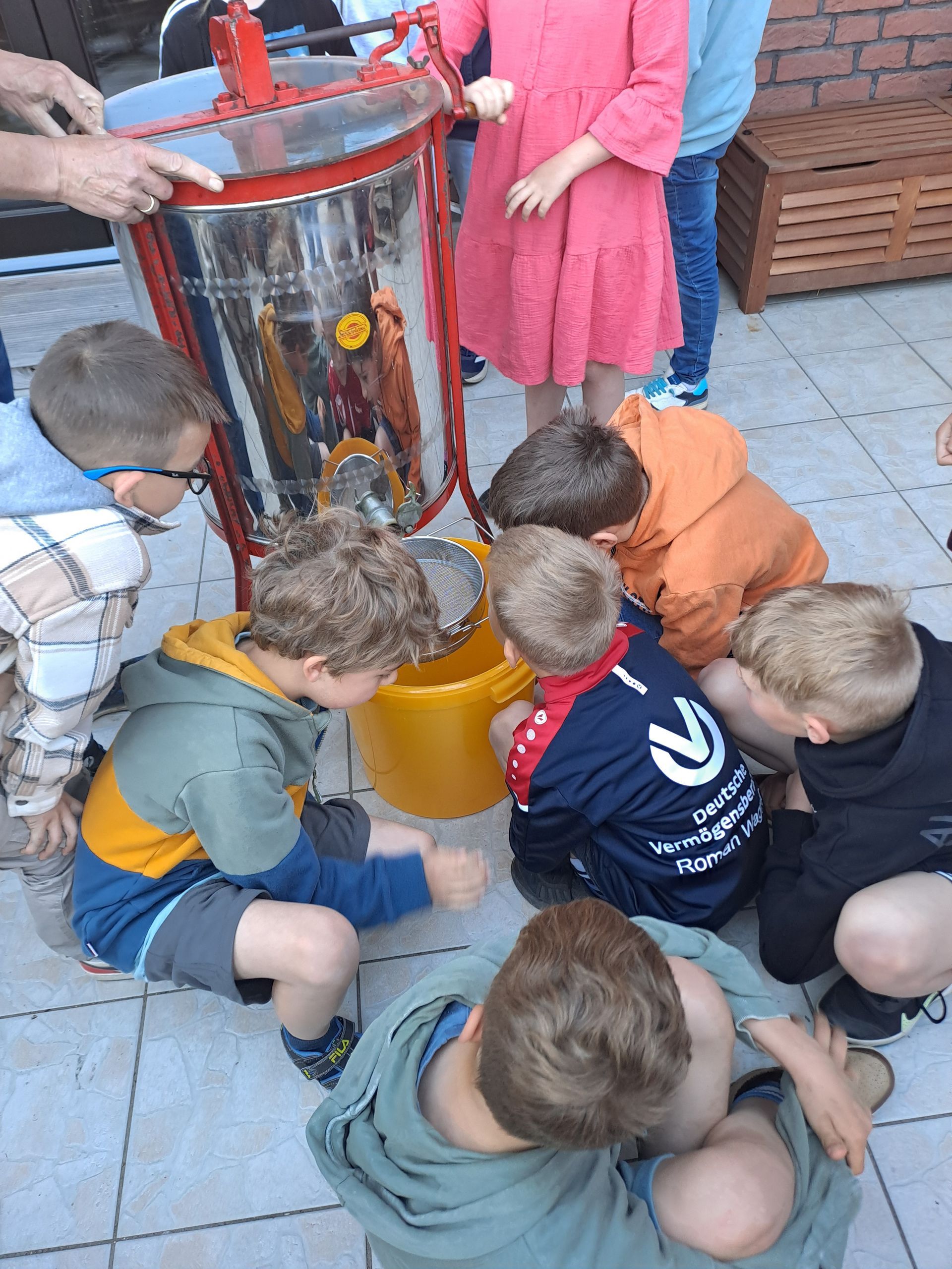 Im Mai besuchten die Drittklässler im Rahmen des Sachunterrichtes die örtliche Imkerei. Wir haben viel über die Bienen und die Gewinnung des Honigs gelernt. Wir durften das Werkzeug eines Imkers bestaunen, haben die Bienenkönigin gesucht, durften selber Honig schleudern und hatten sogar echte Drohnen auf unserer Hand. Das war ein tolles Erlebnis! Vielen Dank an Udo und Conny, dass wir so viel lernen durften.